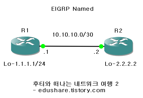 AS번호를 이용하는 EIGRP와 대부분의 설정 방법은 같으며 축약, 인증 설정 외에 여러 가지 다양한 옵션들을 활용하여 세밀하게 설정이 가능합니다. 설정을 마친 후 #show ip eigrp ? #show ip route 등의 명령어를 통해 설정 확인이 가능합니다.