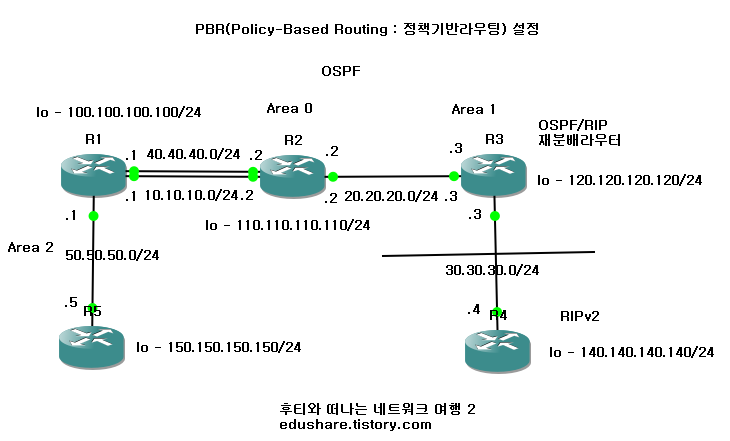 아래와 같은 실습 토폴로지에서 R1에서의 PBR설정만을 보도록 하며 그 외 기본적인 설정은 완료된 상태로 R5의 루프백에서 R4의 루프백으로 통신이 가능한 상태로 R5에서 #traceroute 140.140.140.140 source 150.150.150.150 명령어를 입력하면 현재 토폴로지의 경우 위쪽 경로(40.40.40.2)로 패킷이 가는 것을 확인할 수 있습니다.
