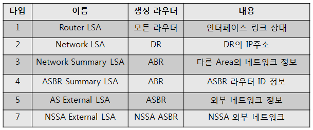 LSA(Link State Advertisememt)는 광고 메시지로 결국은 OSPF가 사용하는 라우팅 정보를 말하며 1 ~ 11까지의 타입의 LSA를 이용하여 라우팅 정보를 전송하며 이러한 정보들은 LSD(Link State Database)에 저장된 다음 최적 경로를 계산하여 라우팅 테이블에 저장하게 됩니다. 이중 자주 사용하는 LSA 타입은 1~5, 7 타입이 되겠습니다.