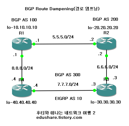 실습에서는 이전의 BGP 속성에 사용한 토폴로지를 그대로 사용하고 하나의 BGP 라우터에서 댐프닝 관련 설정에 대해서 진행해보도록 하겠습니다.