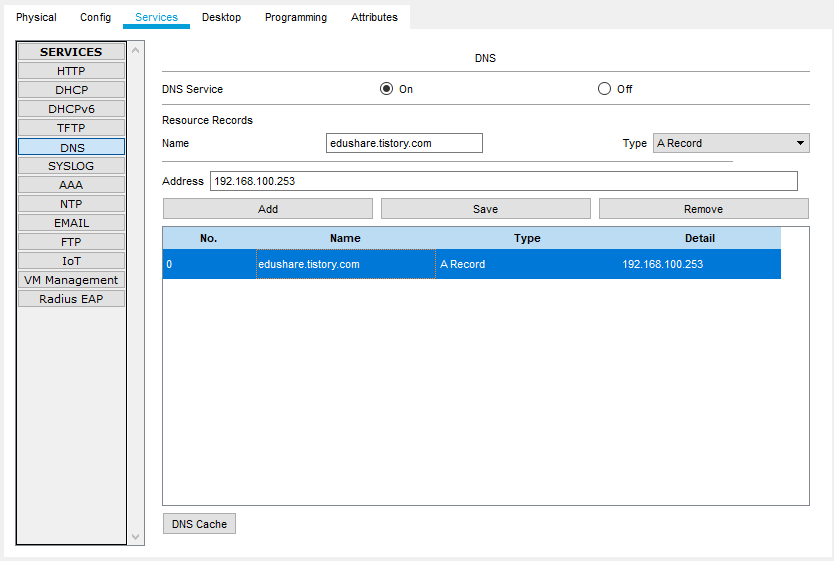이 후 클라이언트의 웹브라우저에서 도메인을 입력 후 접속했을 때 웹페이지가 보여지면 DNS 설정은 잘된 것으로 A Record는 도메인 -> IP주소로 매핑한 정보를 담고 있는 레코드이며 패킷트레이서의 DNS에는 이 외에 CName, SOA, NS 레코드가 있습니다. 정상적으로 도메인으로 접속이 가능하기 위해서는 클라이언트의 DNS에 192.168.100.254를 지정하여야 됩니다.