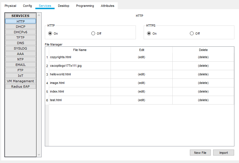 클라이언트에서 주소를 정상적으로 받아왔으면 HTTP/HTTPS 서버 설정 후 웹브라우저에서 IP주소로 접속이 가능한 지 테스트해보면 됩니다. DHCP와 같이 Services탭 -> HTTP에서 설정이 가능한데 특별히 설정해줄 것은 없으며 상태가 On되어있으면 됩니다. File Manager를 통해 간단하게 웹페이지를 생성하거나 수정을 할 수 있습니다.