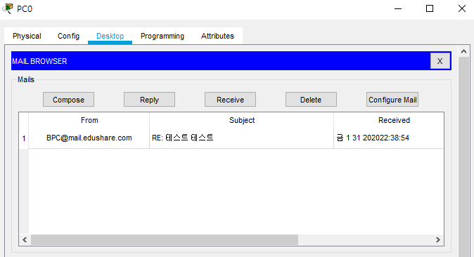 이 후 테스트를 위해 APC에서 MAIL BROWSER창에서 Compose를 클릭하여 메일을 작성하여 전송하고 BPC의 MAIL BROWSER에서 Receive를 클릭하면 메일을 수신받을 수 있고 Reply를 클릭하여 답장도 보낼 수 있으며 메일을 더블 클릭하여 세부 내용도 확인이 가능합니다.