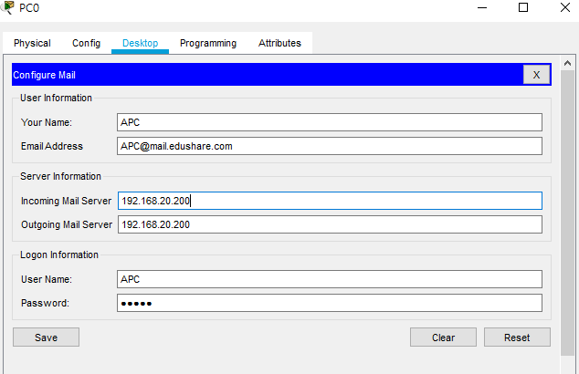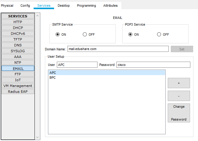 E-Mail 서버는 유저간에 메일을 주고 받을 수 있도록 해주는 것으로 패킷트레이서의 서버 장비에서 Services 탭 -> EMail에서 설정이 가능합니다. On상태가 되도록 체크한 후 메일서버 도메인을 입력 후 Set을 클릭하여 설정한 후 아래와 같이 메일 사용자 계정을 생성합니다. 실습에서는 APC / BPC 두 명의 사용자를 생성했으며 패스워드는 cisco로 설정했습니다.