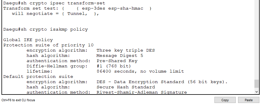 Daegu라우터와 Seoul라우터의 설정은 아래와 같으며 괄호 부분은 Seoul라우터의 설정이며 다른 부분들은 똑같이 설정하면 됩니다. 설정 후 확인은 #show crypto ipsec sa 명령어를 통해 IPSec 내용을 확인할 수 있으며 #show crypto isakmp policy 명령어를 통해 정책 내용도 확인할 수 있습니다. 또한 #show crypto isakmp sa 명령어를 통해 상태 확인이 가능합니다. 이 외에도 #show crypto map 명령어로 맵 설정도 알 수 있습니다.
