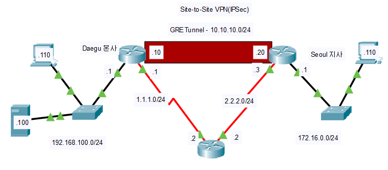 GRE터널링 구축에서 사용한 토폴로지를 그대로 사용할 예정으로 IPSec관련 설정 부분만 따로 보고 GRE 터널링 구축은 이전 글을 참조하면 됩니다.