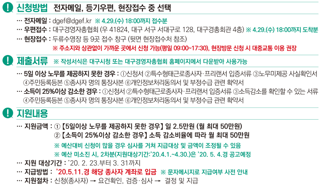 대구시 외에 전국 지자체별로 무급휴직 근로자와 고용보험 미가입 특수형태 근로자 및 프리랜서를 위한 특별지원금 정책이 있으므로 알아보고 진행하시면 될 듯 합니다.