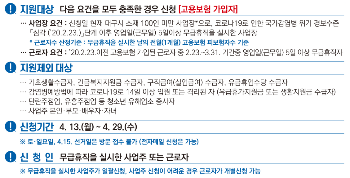 대구시의 특별지원사업을 기준으로 먼저 무급휴직근로자 지원사업을 보면 고용보험 가입자로서 대구시 소재 100인 미만 사업장으로 2월 23일 이후 영업일 5일이상 무급휴직을 실시한 사업장이고 2월 23일 이전 고용보험 가입된 근로자 중 2.23 ~ 3.31 기간 중 5일 이상 무급휴직한 근로자가 지원대상에 해당이 됩니다.