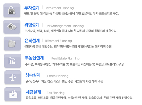 개인재무컨설팅에서 제공하는 서비스는 투자, 위험, 은퇴, 부동산, 상속, 세금 설계가 있으며 연령별에 따른 재무관심사와 필요한 자산이 다르므로 컨설팅을 통해 설계를 받는 것이 무엇보다 좋습니다.