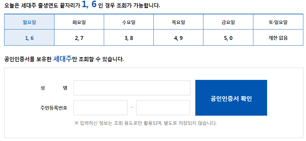 접속이 몰리는 것을 방지하기 위해 공적마스크 구입과 같이 요일제를 시행하여 조회할 수 있어 오늘 월요일의 경우 출생연도 끝자리가 1, 6인 경우만 조회가 가능하며 공인인증서가 필요합니다.