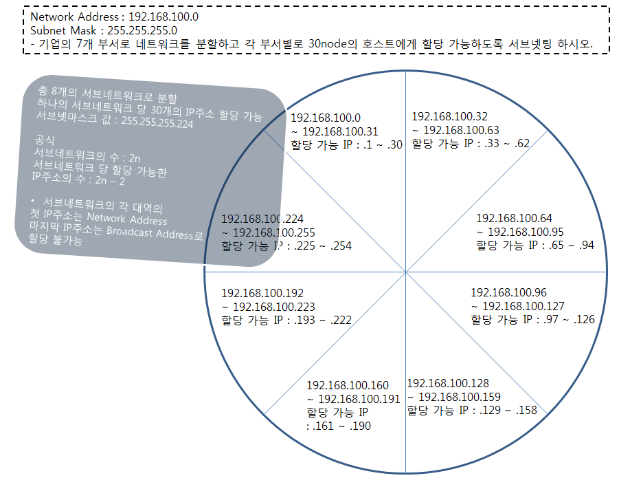 만약 기업에 할당된 네트워크 주소가 192.168.100.0 255.255.255.0일 때 기업에 7개의 부서가 있고 하나의 부서 당 30노드에게 할당할 IP가 필요하다면 어떻게 해야 될까요?
