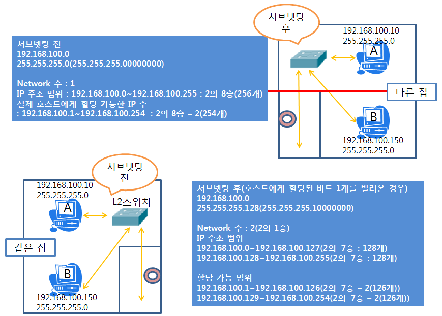 A, B호스트는 서브네트워크로 분할되기 전에는 192.168.100.10주소를 가진 호스트와 192.168.100.150주소를 가진 호스트는 같은 한 집에 살았지만 호스트에게 할당된 8비트 중 1개의 ‘0‘비트를 빌려와 네트워크를 분할하기 위해 비트’1‘로 변경했습니다. 이럴 경우 원래 한 집이었던 것이 공식에 따라(2의 n승)완전히 다른 별개의 두 집으로 분할이 되고 각 집에서 사는 호스트는 주소에 따라 달라지게 됩니다. 위의 그림에서와 같이 분할이 된 후 192.168.100.10주소를 가진 호스트와 192.168.100.150을 가진 호스트는 완전히 분리된 다른 집에 살게 됩니다. 이 때 서브넷 마스크 값은 255.255.255.00000000에서 255.255.255.10000000(128)로 변경이 됩니다. 이진수 ’00000000’은 십진수 ‘0’이며 이진수 ‘10000000’는 십진수 ‘128’이 됩니다.
