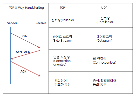 TCP와 IP는 TCP/IP와 같이 붙여서 표기를 하게 되는데 앞서 설명한 우체부와 주소를 생각하면 되는데 우체부와 주소가 정확해야 목적지에 제대로 배달이 되기 때문에 붙여 표기를 하며 TCP외에 4계층 전송 프로토콜로 UDP가 있습니다. TCP는 3-Way Handshaking(악수)과정을 통해 신뢰성 있는 전송을 하는 연결형(Connection) 프로토콜인 반면 UDP는 신뢰성이 다소 떨어지는 비연결형(Connectionless)프로토콜로 TCP는 송수신 간 연결을 확립한 후 전송이 이루어지며 UDP는 송수신간 연결 없이 전송이 이루어지는 방식을 말합니다.