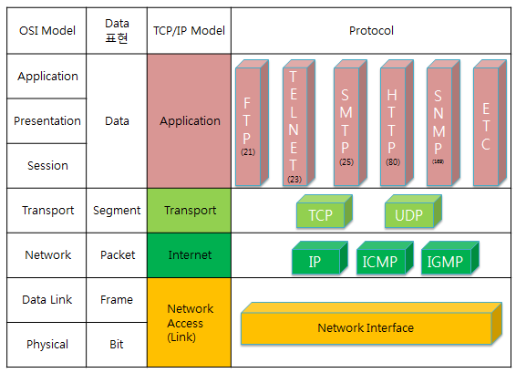 프로토콜(Protocol)이란 한 마디로 통신 규약 / 통신 규칙이라고 할 수 있습니다. 원활한 데이터 전송을 위해 지켜야 되는 규칙으로 데이터를 송수신하기 위해서는 많은 프로토콜들이 이용되고 있으며 앞서 살펴본 OSI Model과도 대응 관계를 이루고 있는데 그 중 현재 인터넷을 위해 가장 많이 사용하는 프로토콜이 바로 TCP(Transmission Control Protocol)와 IP(Internet Protocol)이며 IP는 앞서본 IP 주소에서의 IP와 같으며 주소에 관여하는 OSI 3계층 프로토콜이고 TCP는 신뢰성 있는 데이터 연결을 위한 OSI 4계층 프로토콜입니다.