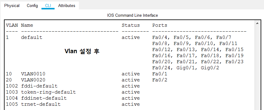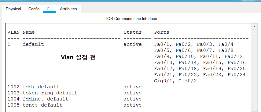 스위치 장비에서 vlan을 설정하지 않더라도 기본적으로 모든 포트가 vlan 1에 할당이 되어있으며 기본값으로 모든 포트에 연결되는 장비는 vlan 1에 속하게 됩니다. 여기서 vlan설정을 변경하면 vlan정보가 바뀌게 되며 이러한 정보들을 확인하기 위해서는 #show vlan, #show vlan brief, #show interface trunk 등의 명령어를 통해 확인이 가능합니다.