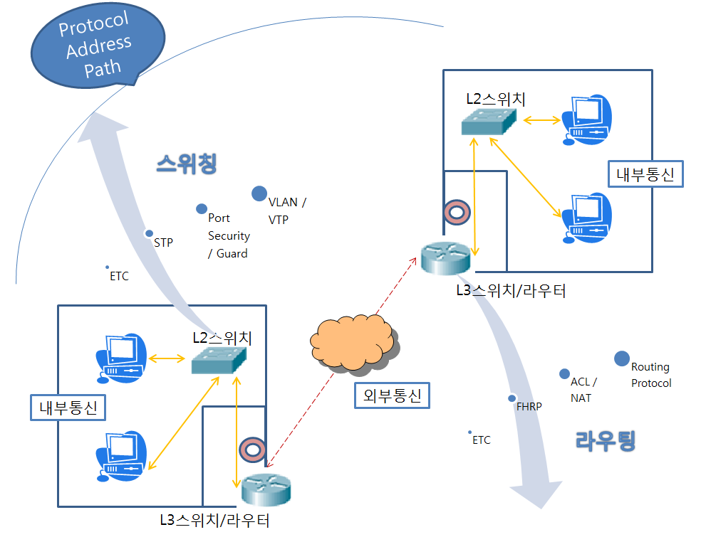 같은 집(내부 네트워크)에 있는 사람끼리 통신을 위해 통상적으로 스위칭 허브라 일컬어지는 L2 스위치(Switch)장비를 이용한 스위칭(Switching)을 통해 통신하고 다른 집(외부 네트워크)에 있는 사람과의 통신을 위해 라우터 및 L3 스위치 장비가 일반적으로 사용되어집니다.