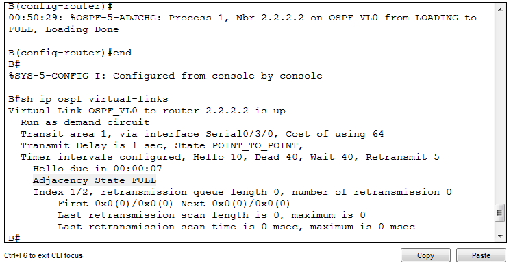가상 링크를 설정 후 B 라우터에서 #show ip ospf virtual-links 명령어를 통해 상태를 확인할 수 있는데 가상 링크 회선의 up, down 상태 외에 중요하게 살펴볼 부분은 Adjacency State 내용으로 FULL 상태일 경우 정상 동작하며 Down 또는 Init 상태일 경우에는 정상 동작하지 않습니다.