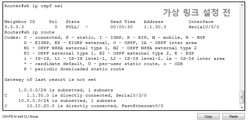 가상 링크를 설정하기 전 Area 2영역에 있는 라우터의 라우팅 테이블과 네이버 테이블을 #show ip route #show ip ospf neighbor명령어로 확인해보면 아래 슬라이드 7-5-1과 같이 네이버 관계는 맺고 있지만 실제 경로 정보는 받지 못해 라우팅 정보가 없는 것을 확인할 수 있습니다.
