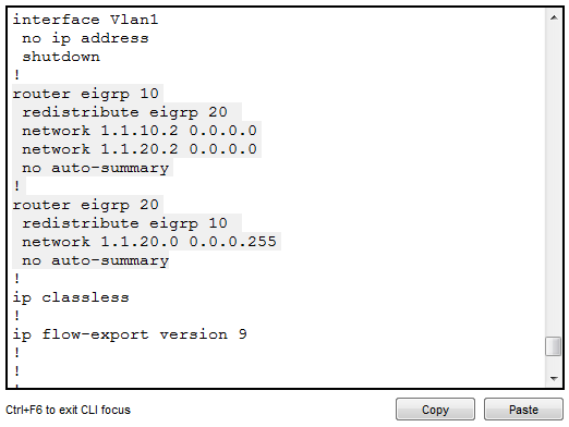 필자는 A 라우터를 재분배 라우터로 설정을 하였으며 관리자에 따라 B 라우터를 재분배 라우터로 설정해도 무관합니다. A 라우터에서의 전체적인 설정 내용을 보면 그림 7-4-2와 같은데 eigrp 10에서 eigrp 20을 재분배하고 eigrp 20에서 eigrp 10을 재분배하면서 경계 대역인 1.1.20.0/24을 광고했습니다.